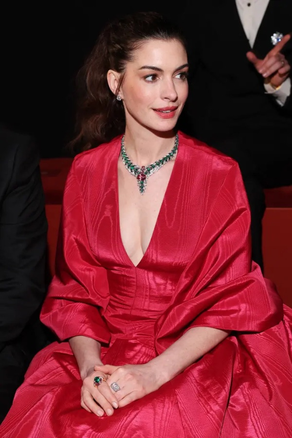 Hathawayjeva je nosila obleko z globokim izrezom, idealnim za njen opazen nakit, z zadnjim delom v slogu ogrinjala, ki je elegantno padalo po njenih ramenih in hrbtu. Da bi še povečala dramatičnost, pa je Hathaway svoj videz dopolnila Bulgarijevo ogrlico Secret Garden.