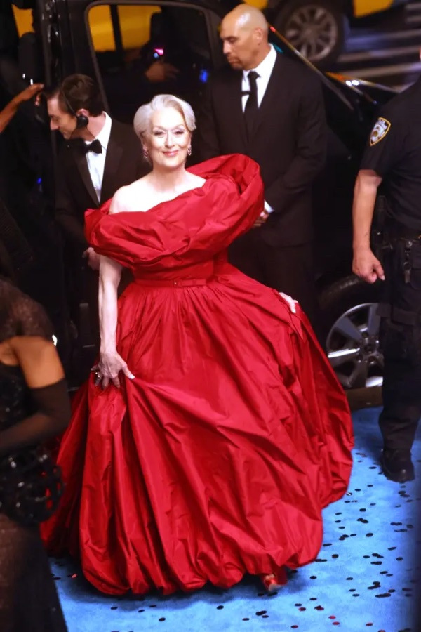 Fotografije, ki so jih posneli paparazzi med snemanjem filma »Hudič nosi Prado 2«, prikazujejo Streepovo v rdeči tafeta plesni obleki, v kateri snema filmsko interpretacijo letne Met Gala.