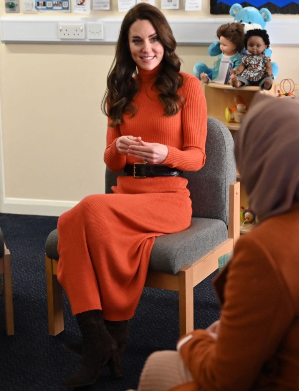 Princesa Walesa je januarja 2023 v Lutonu nosila kamelji plašč nad oranžno obleko.