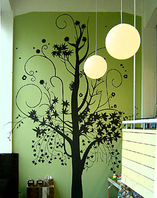 Aja, še tole - baje imajo pri nas v trgovini Butlers (specializirana za dodatke za dom), takšne 'nalepke' za na steno in imajo same take zanimive motive, menda ti lahko še posebej zate naročijo željenega, ker nimajo vseh vedno tam. Ni glih nalepka, ampak je na način tattoojev v čigumijih, če se spomnite. Na foliji, pa potem preneseš na steno, fajn podrgneš, potegneš dol in se ta vzorec prenese s folije na steno. Izgleda čisto enako, kot narisano.