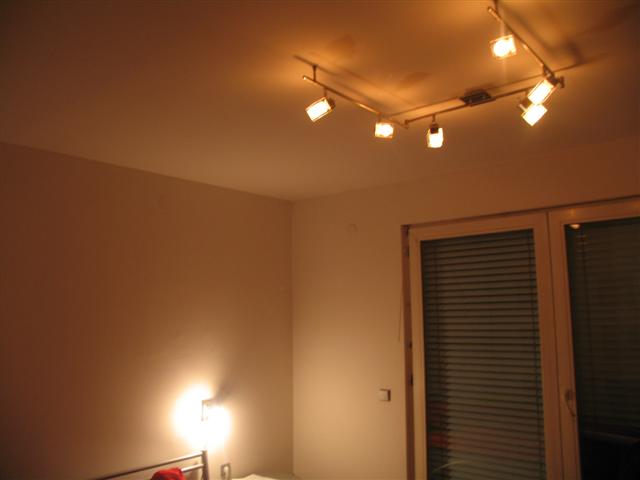 V spalnici imam na dveh mestih odprtino za elektriko, kamor lahko pride stropna luč (sedaj sem zaenkrat brez luči in sta obe odprtini odprti). Težava je, da niti ena izmed teh odprtin ni na sredini (da bi luč dala na sredo, drugo luknjo pa zaprla). Ena je 50 cm od omare, druga pa kak meter od nasprotne stene, vendar, kot že rečeno, daleč od tega, da bi bila katera na sredini. Problem je, da je električar pojamral, da je to preveč razbijanja v beton, če bi želela še tretjo odprtino na sredi in da naj nekako uporabim obstoeči odprtini.