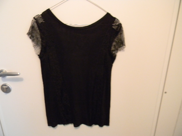 Zara bombažna in čipkasta črna majčka velikosti M. Zadaj na hrbtu ima po sredini črno čipko- je prosojan, ravno tako so rokavčki iz čipke. Sprednji del je bomabažen in zakrit. Cena 4 evre.