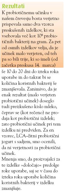 Če se vrnem k jogurtom, meni so tudi večinoma nekam odveč, jih pa obvezno pijem zjutraj, kadar se me kake prebavne motnje lotevajo (ali so že mimo), in je učinek očiten (če je torej črevesno prebivalstvo okrnjeno zaradi kake driske, antibiotikov ipd., so vsekakor dobrodošli tudi jogurti, četudi morda nimajo ravno na ziljone bakterij/ml ipd.). Z vidika krepitve imunskega sistema kar na splošno pa nekega silnega vpliva niti nimajo, niti na prebavila sama, če je tu položaj že sam po sebi "urejen" (torej ustrezna črevesna flora). Jogurti/kapsule (lahko vzameš samo eno dan, oz. po navodilih) so dobrodošli pri vseh, ki bi si želeli urediti prebavo, oz. v času jemanja antibiotikov, v času driske, tiste z "napihnjenim trebuhom", napenjanjem, ipd. Tudi, če iz želodca res "odide" naprej le še izbrana peščica "dobrih" bakterij (pa dvomim, da kar vse pobijemo s kislino, razredčeno z jogurtom in drugo hrano), so te v topogledno pomanjkljivem črevesju dobrodošle, sicer se razrastejo lahko druge, manj ugodne prebivalke.