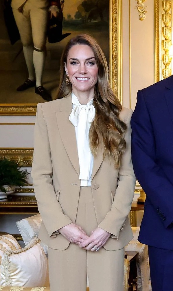 15. oktobra se je Kate vrnila na domača tla, pripravljena na sprejem jordanskega prestolonaslednika Husseina in princese Rajwe v Windsoru v okviru evropske turneje, ki je vključevala postanek v Parizu 8. oktobra. 43-letna žena princa Williama je bila brezhibna, ko je pozirala za fotografijo, saj je skromnemu bežemu kostimu dodala kraljevski sijaj.