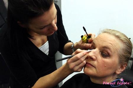 Nato je prišlo na vrsto ličenje. Vizažistka Aleksandra je najprej nanesla tekočo podlago v odtenku barve kože in matirala kožo s transparentnim pudrom v prahu. Na veke je v notranji kotiček oči ter pod obrvi nanesla mat seničo belo-zlate barve. Ob trepalnice je nanesla črn svinčnik, ki ga je mehko zabrisala, nato je na premično veko nanesla hladen odtenek temno rjave barve in ponovno zabrisala. V pregib veke je nato nanesla topel rjav odtenek in ga mehko zabrisala v smeri proti obrvem. Tanji je še oblikovala obrvi in jih nežno poudarila, nato pa nanesla črno maskaro in s temno rjavim odtenkom obrobila spodnjo veko. Na ličnice je nanesla topel odtenek roza-rjavega rdečila za lice in na ustnice nevtralno šminko in glos za lesk in polnost ustnic.